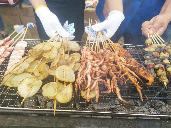在架好炉子,点燃炭火后,大家开启了边烤边吃的模式。